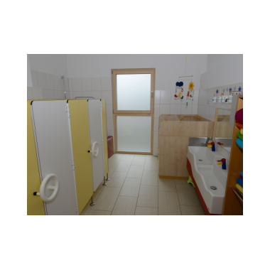 ImKinderbadbefinden sich die verschieden hohen Toiletten, Waschbecken, die auch zum Planschen geeignet sind, eine Dusche, sowie der Wickeltisch.