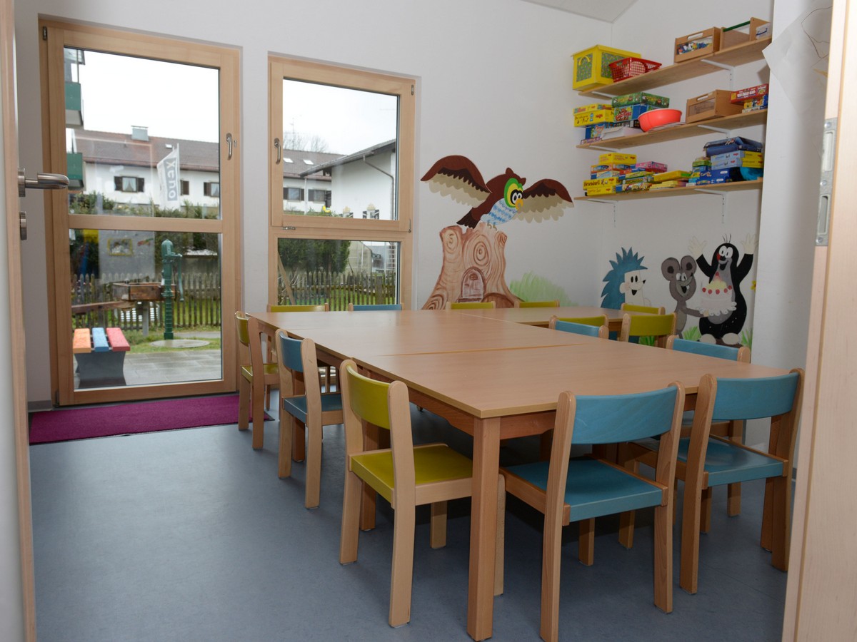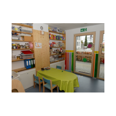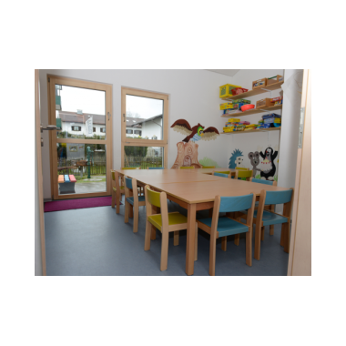 DasEsszimmerfungiert nicht nur für die gemeinsamen Mahlzeiten, sondern auch für pädagogische Angebote, wie z.B. Tischspiele. Es besitzt eine Tür zu Terrasse und Garten.