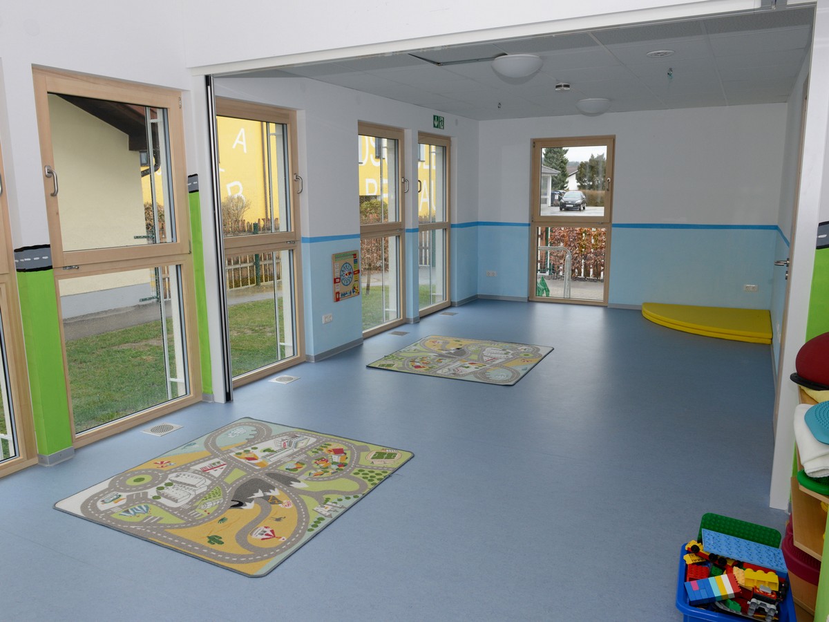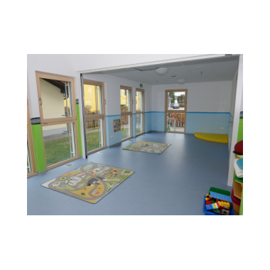 DergroßeBewegungsraumist durch eine bewegliche Trennwand abgeteilt. So steht uns eine Tobe- und Bewegungsfläche zur Verfügung, die mit großen Weichmatten und Schaumstoffbausteinen ausgestattet ist, gleichzeitig wird die andere Hälfte des Raumes für Rollenspiele und als Bauecke genutzt.Benötigen wir einen größeren Raum, so wird die Trennwand zurückgeschoben.