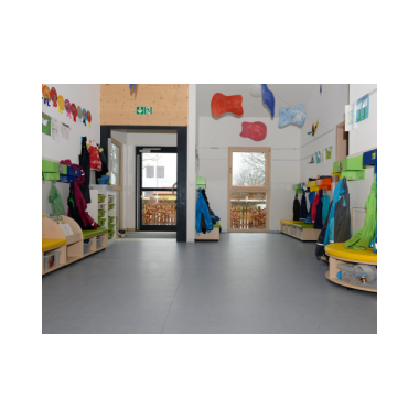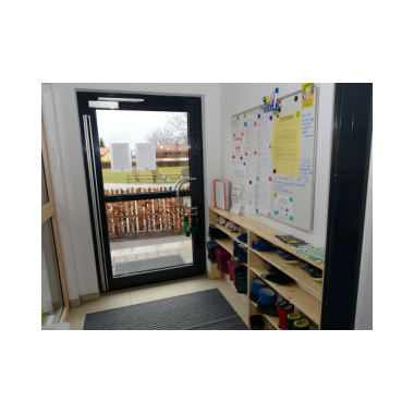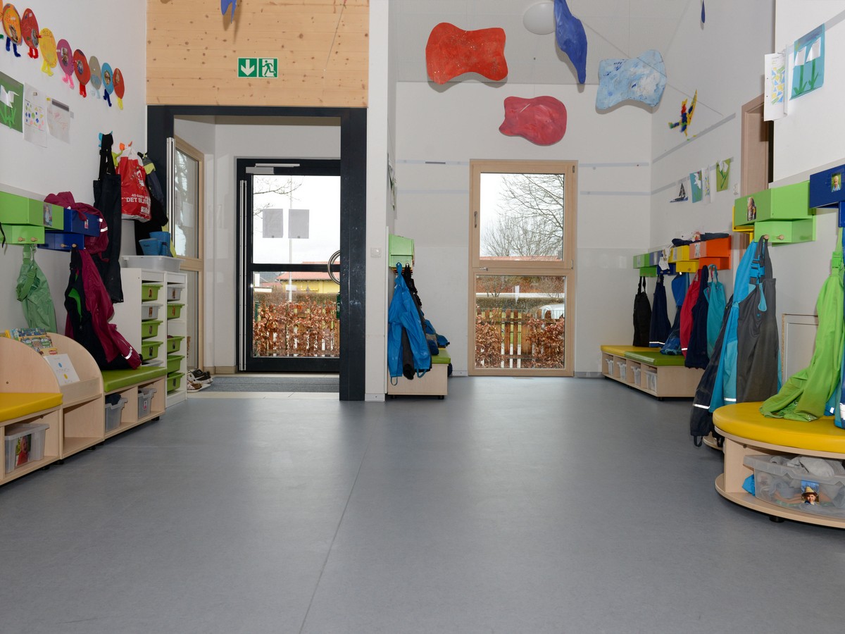 Im hellenEingangsbereich befinden sich die Garderobenplätze der Kinder, eine Lese- und eine Kuschelecke.