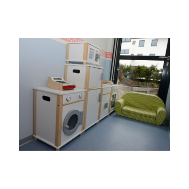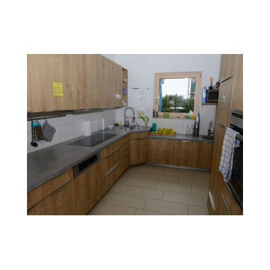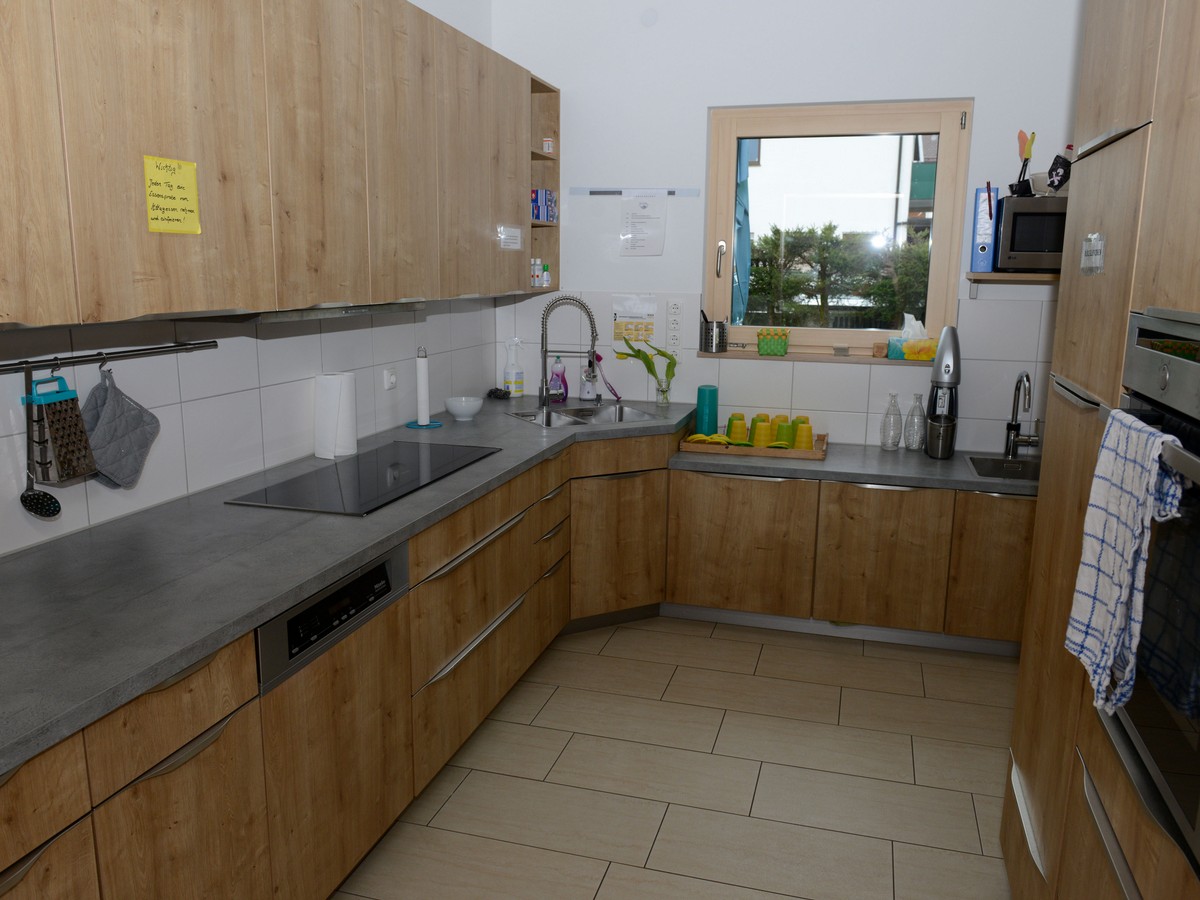 DieKücheist modern und kindersicher ausgestattet. Dort wird täglich das Mittagessen frisch von der diensthabenden Mutter zubereitet. Einmal wöchentlich findet ein pädagogisches Kochen gemeinsam mit den Kindern statt.