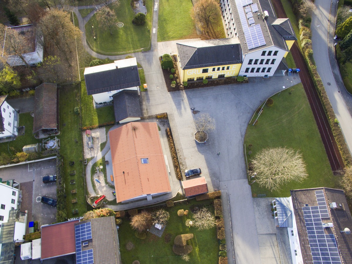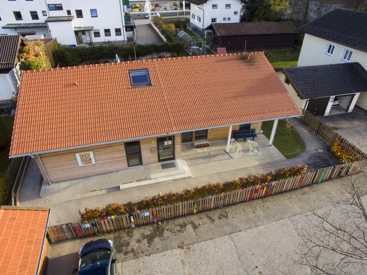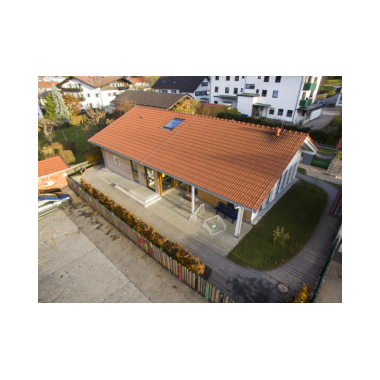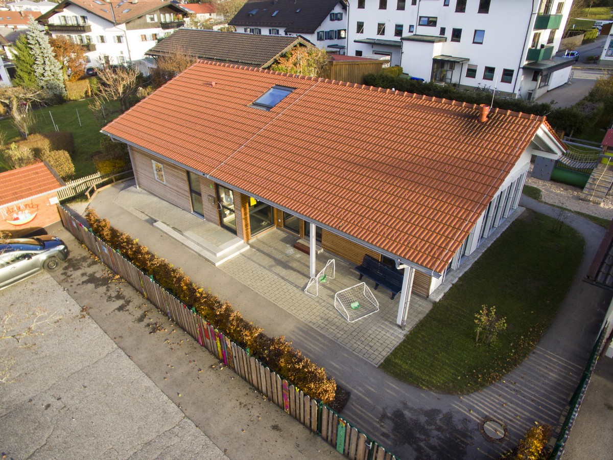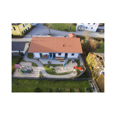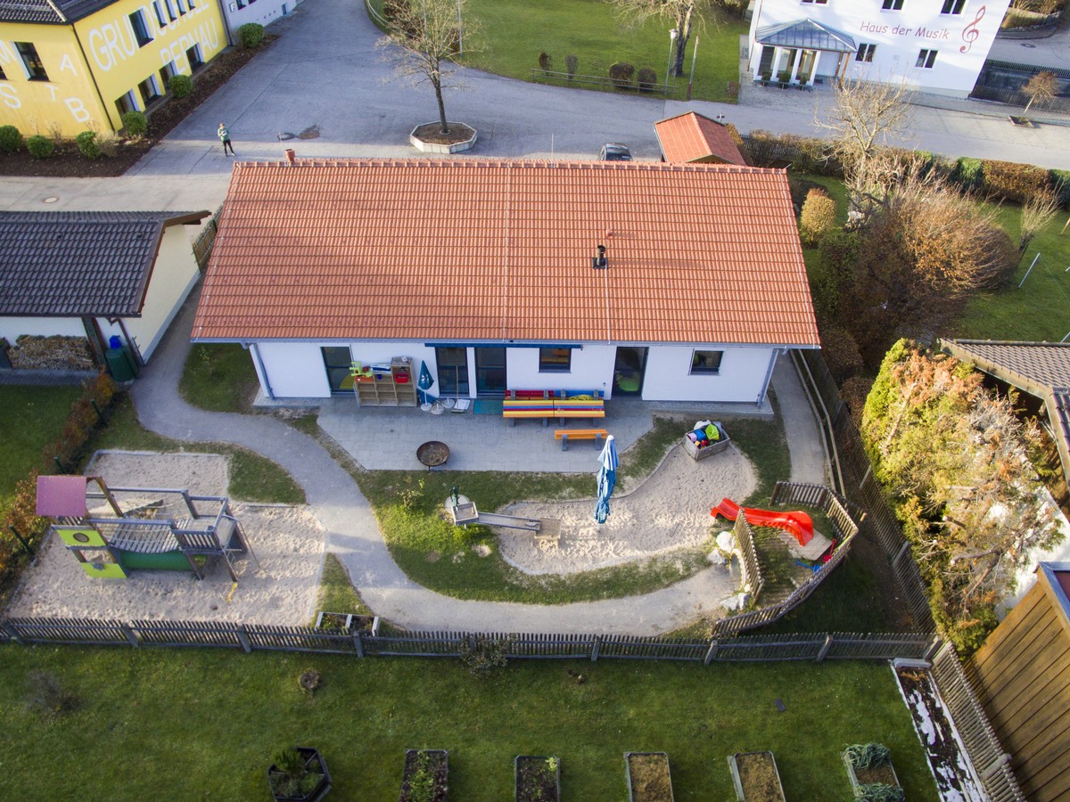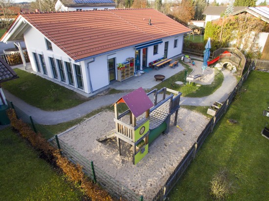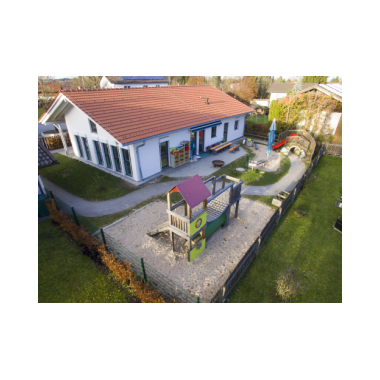 Im Außenbereich befindet sich eine Bobbycarstrecke, die um das Haus herumführt.Die Wegstrecke geht durch den gesamten Garten, durch einen Tunnel im Berg und hat eine kleine Steigung an der Ostseite.Zur Südseite hin sind ein Kletterspielgerät, die Terrasse, der Sandkasten, die Rutschbahn und die Wasserstation zu finden. Auf der Nordseite steht das Gerätehäuschen und es gibt ausreichend Platz für die Kinder, um mit Straßenkreide zu malen. Ein separater Abstellplatz für Fahrräder und Kinderwägen findet sich rechter Hand des Eingangsbereichs im Norden.